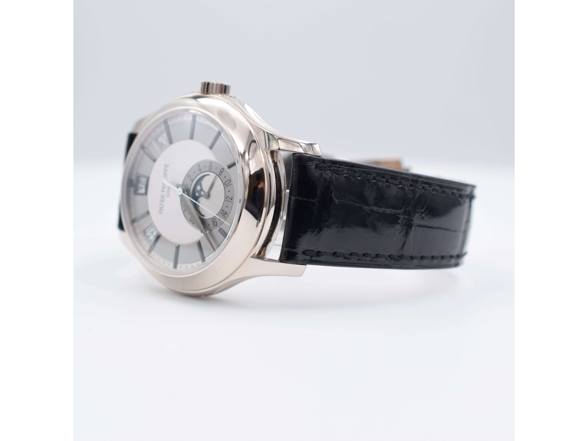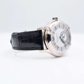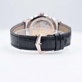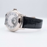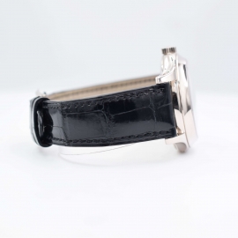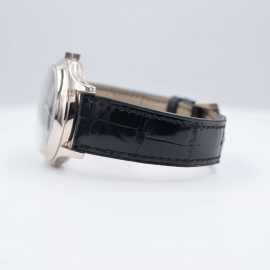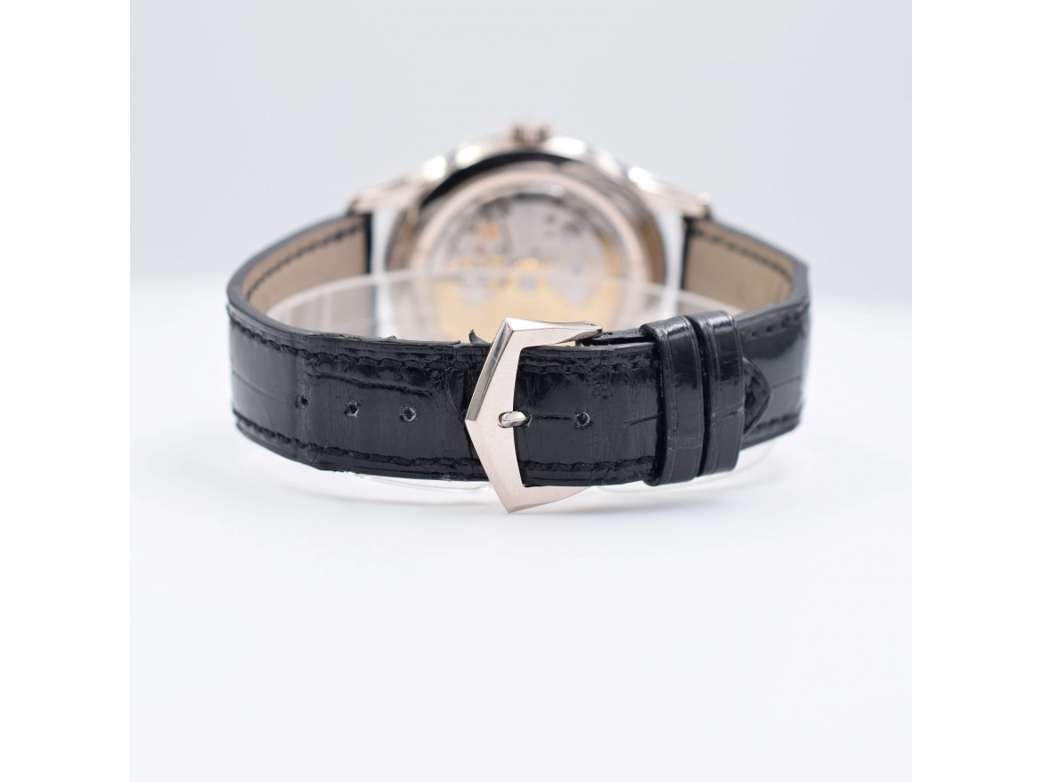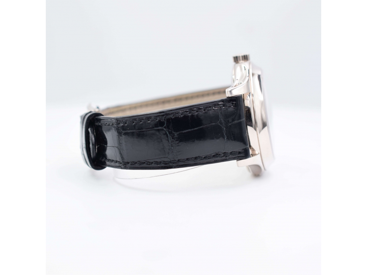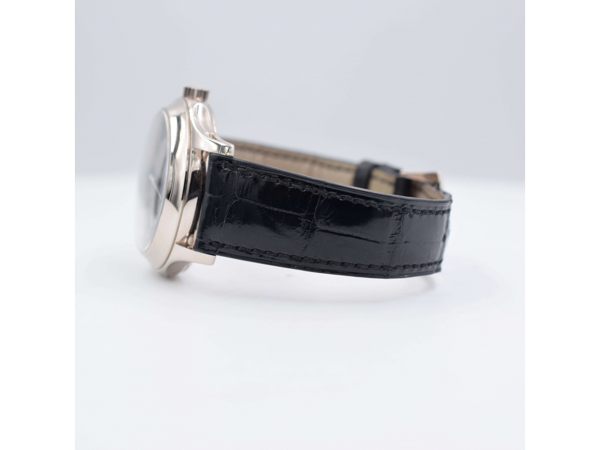 Cassa in oro bianco, fondo in cristallo di zaffiro, diametro 40 mm, spessore 11,36 mm, un elegante quadrante con indici applicati in oro. Movimento meccanico a carica automatica. Calibro 324 S QA LU 24H/206. Giorno, data e mese in finestrelle. Indicazione 24 ore. Secondi al centro. Bracciale Alligatore a squama quadrata, cucito a mano, nero lucido. Fibbia ad ardiglione.