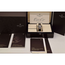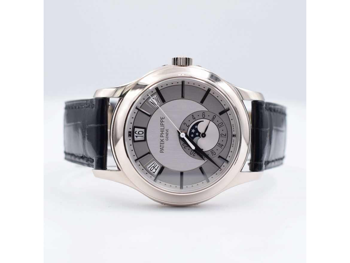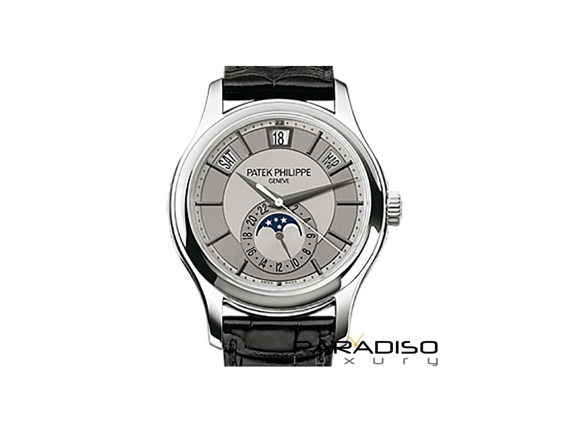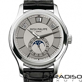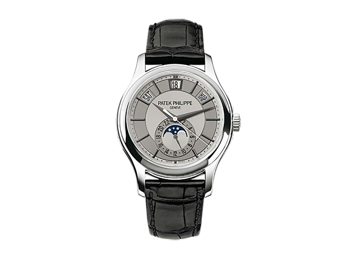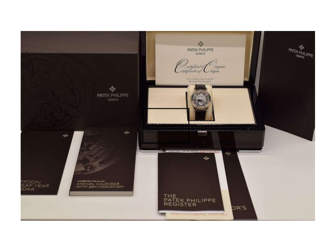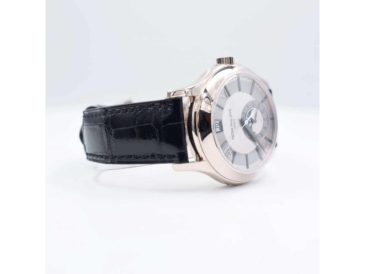 Cassa in oro bianco, fondo in cristallo di zaffiro, diametro 40 mm, spessore 11,36 mm, un elegante quadrante con indici applicati in oro. Movimento meccanico a carica automatica. Calibro 324 S QA LU 24H/206. Giorno, data e mese in finestrelle. Indicazione 24 ore. Secondi al centro. Bracciale Alligatore a squama quadrata, cucito a mano, nero lucido. Fibbia ad ardiglione.