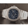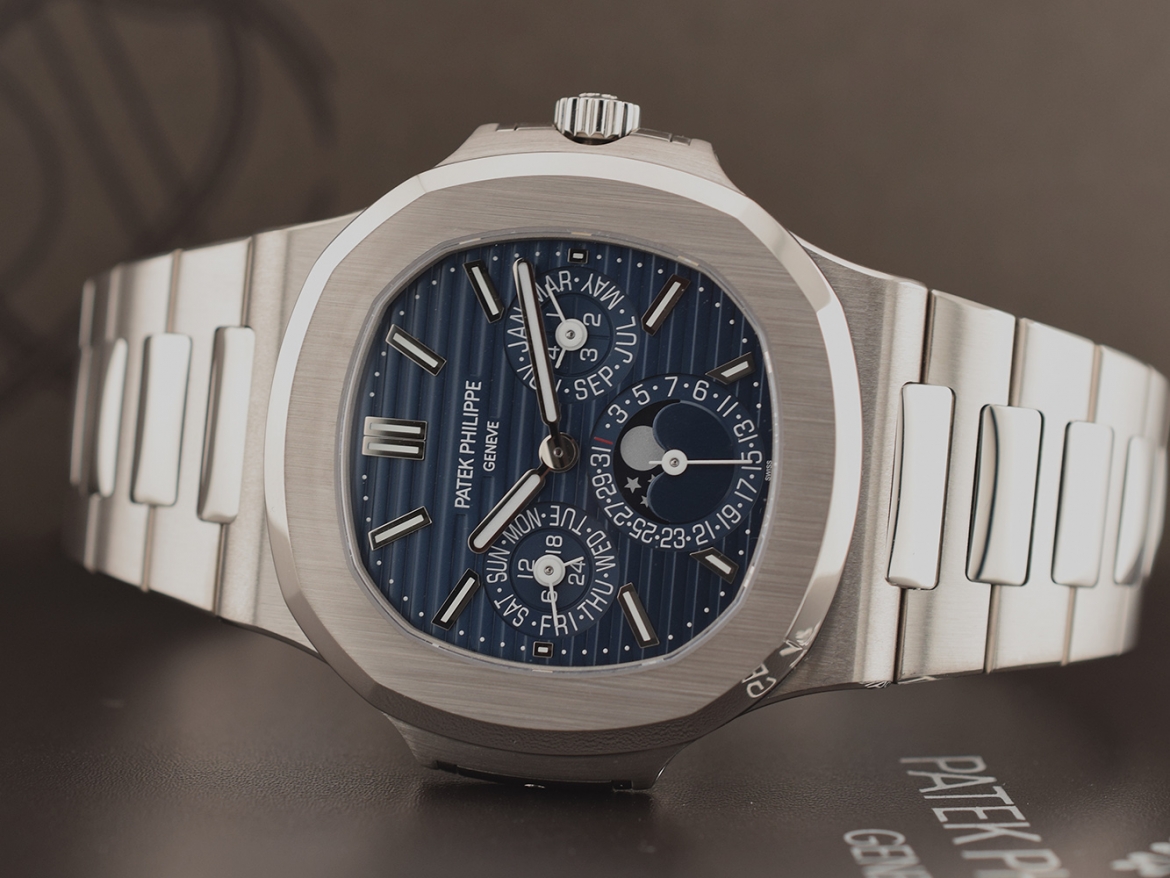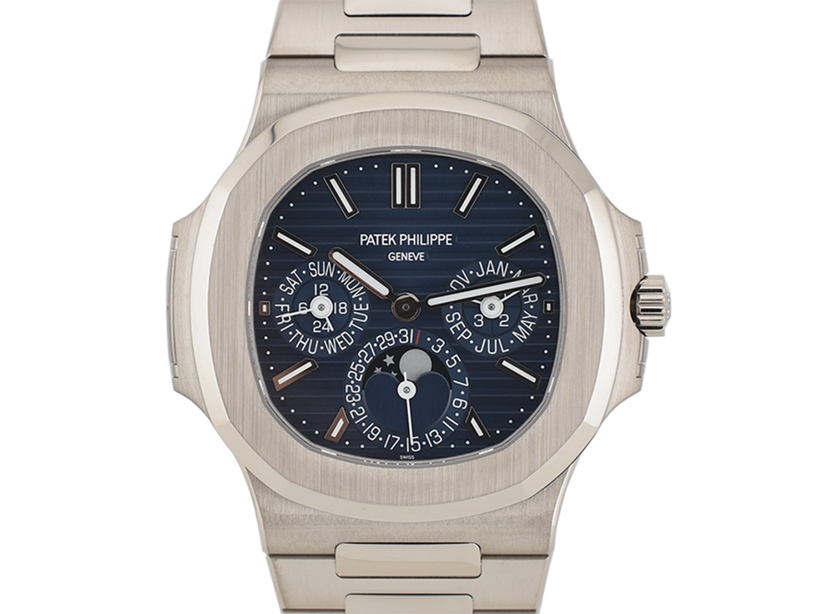 Il Nautilus con calendario perpetuo Ref. 5740/1, la prima grande complicazione nella collezione Nautilus. La cassa in oro bianco 40 mm con quadrante Blu Soleil è impermeabile fino a 60 metri. Grazie alla presenza del celebre calibro ultrapiatto 240 Q a carica automatica mantiene uno spessore straordinariamente ridotto diventando il calendario perpetuo più piatto nelle collezioni Patek Philippe. Il bracciale in oro bianco è dotato di un nuovo fermaglio déployant Nautilus che offre una sicurezza ottimizzata.