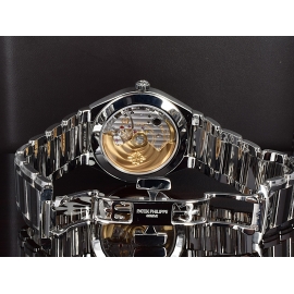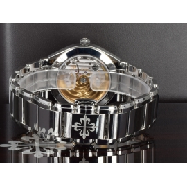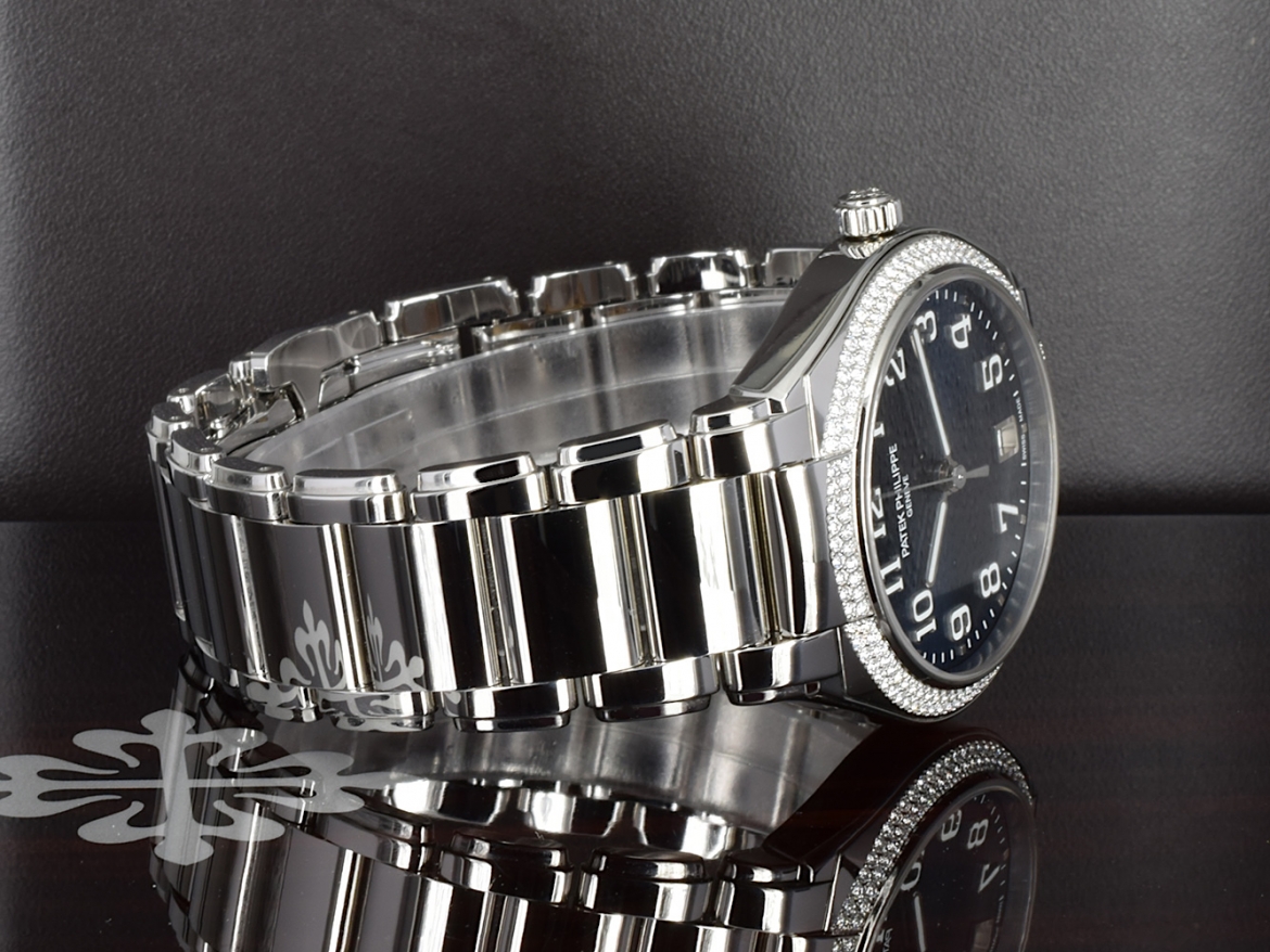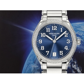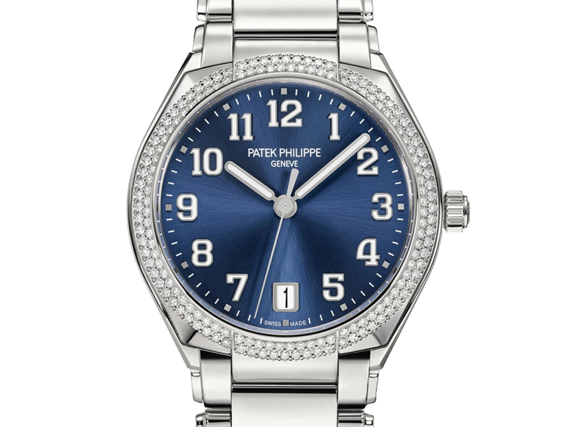 Patek Philippe Twenty~4 Automatic, la nuova espressione dell’eleganza al femminile, cassa in acciaio esibisce una lunetta con 160 diamanti incastonati 0,77 ct e un quadrante blu soleil con cifre applicate in oro, rivestimento luminescente. Calibro 324 S C a carica automatica, visibile attraverso il fondo cassa in cristallo di zaffiro, con ore, minuti e secondi al centro e data all’interno di una finestrella a ore 6.