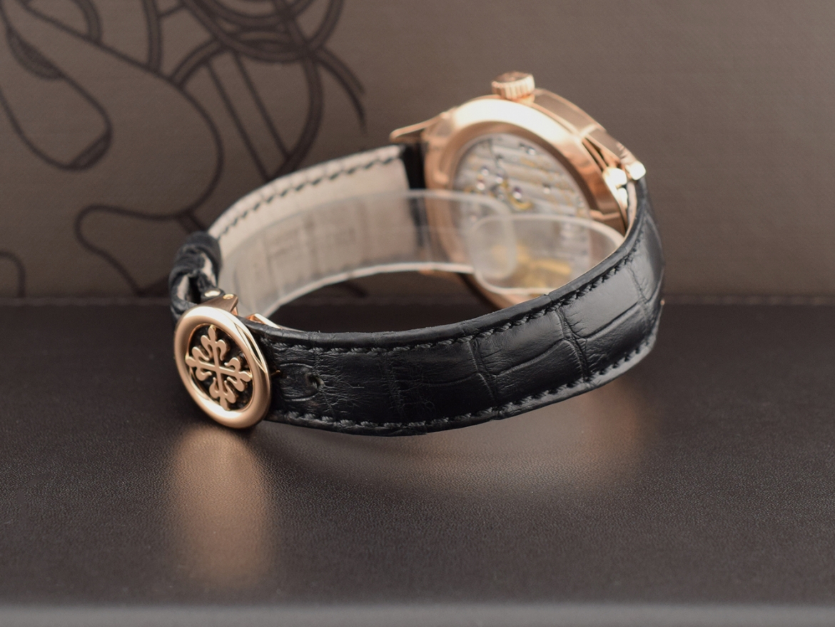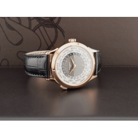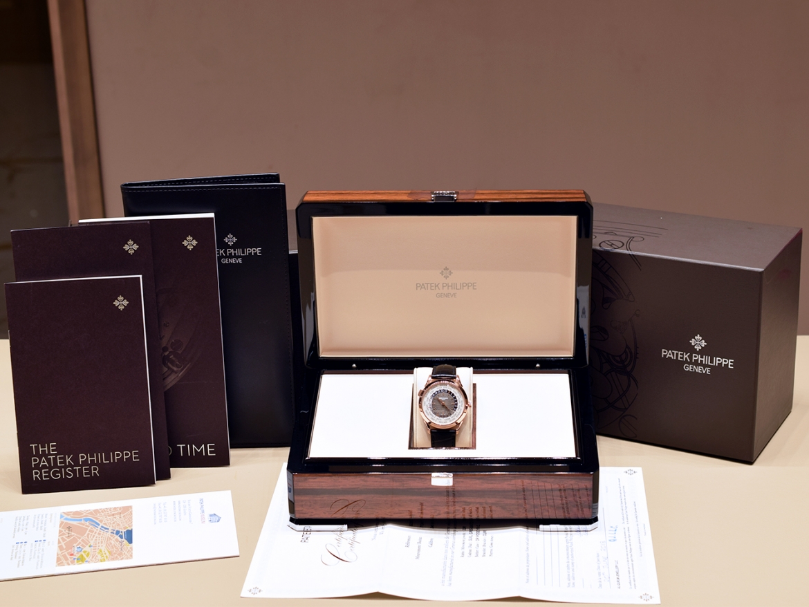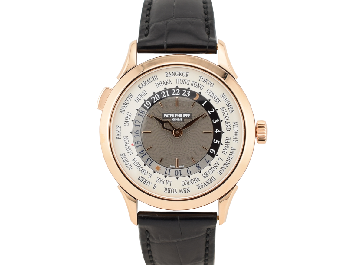 Il celebre World Time, l'orologio icona di viaggiatori e collezionisti, si rinnova con una cassa in oro rosa ridisegnata, una lancetta delle ore lavorata e dal design esclusivo Patek Philippe e un centro del quadrante laccato grigio antracite, guilloché a mano, indici applicati in oro, movimento meccanico a carica automatica calibro 240 HU. cassa oro...